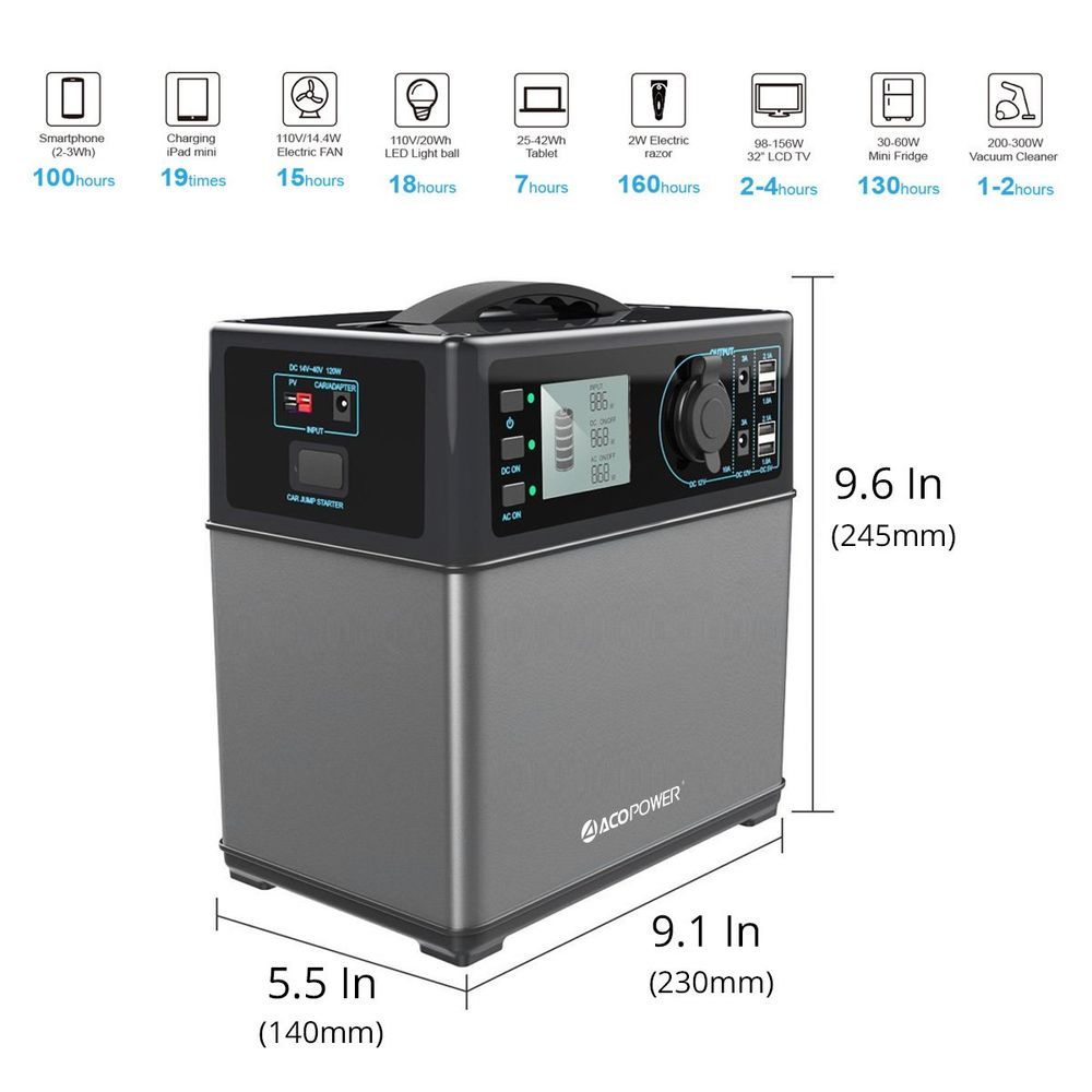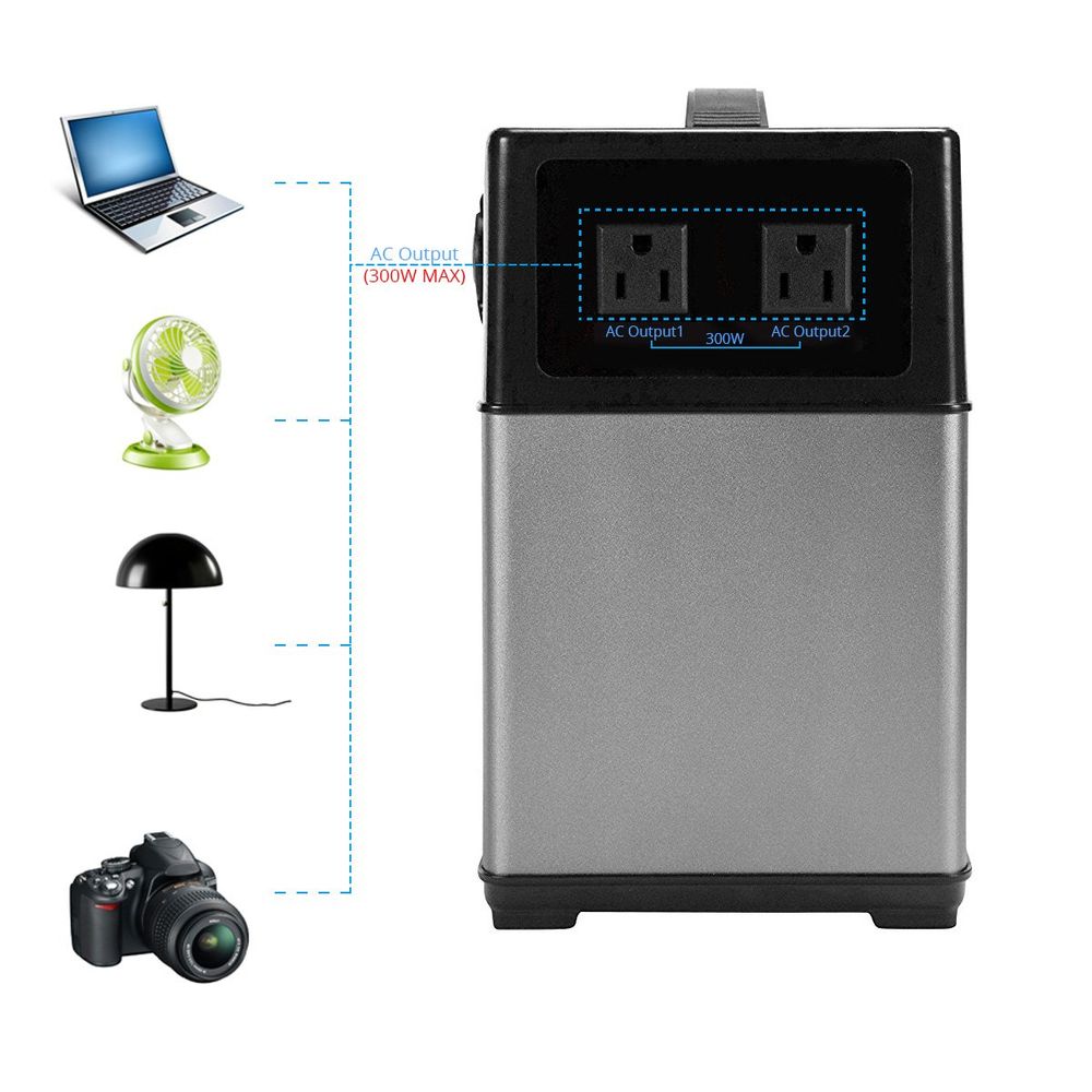- The portable solar generator was designed for camping and UPS. A capacity of 400wh for most of the family devices. Two AC 110V outputs shares 300w, DC 12V 120w car output for car refrigerator and devices. A full charge supports 7 hours laptop/tablet, 13 hours 30-60w mini fridge, 15 hours electric fan, 18 hours 20w light, 19 times ipad mini, 100 hours smartphone, and 160 hours 2w electric razor