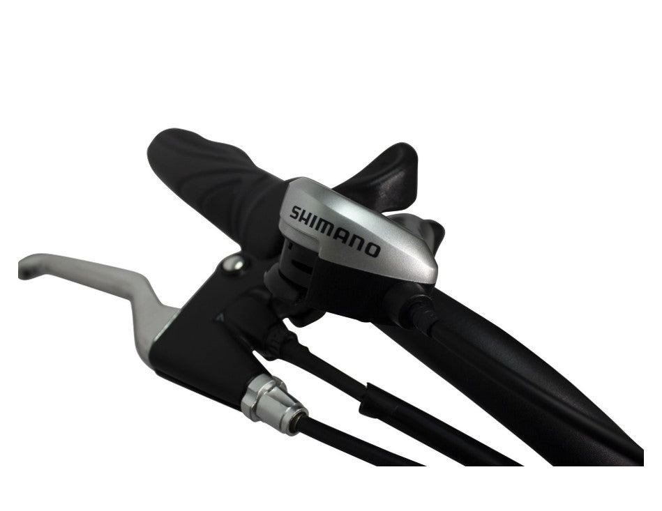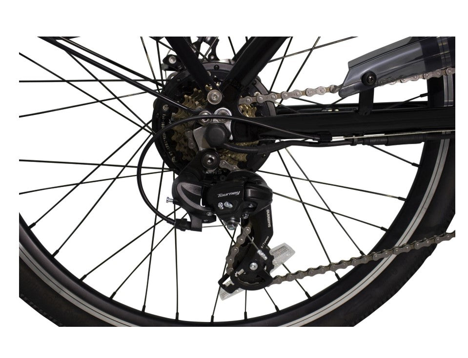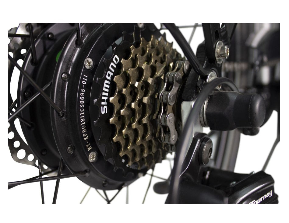 The VELLER 36 Volt Electric Cruiser Bicycle (E-Bike) by American Electric is a Lithium-Ion Battery powered Electric Bicycle cranking out 350 watts from the powerful rear hub motor. This 100% hand welded lightweight aluminum frame bicycle has our 7 Speed Shimano Tourney® Gears & Shifting System, a battery pack consisting of 7 lightweight lithium cells running at 36 volts 10 amps and oversize 26" x 2.175 high-performance tires, aluminum rustproof coated rims with quick release axle on the front and a water proof quick disconnect on the rear wheel, for a quick and easy tire change.