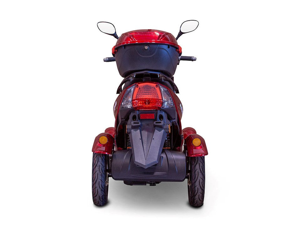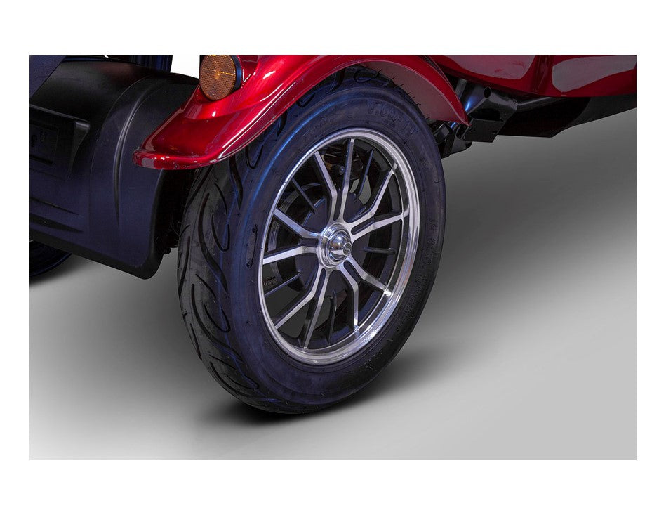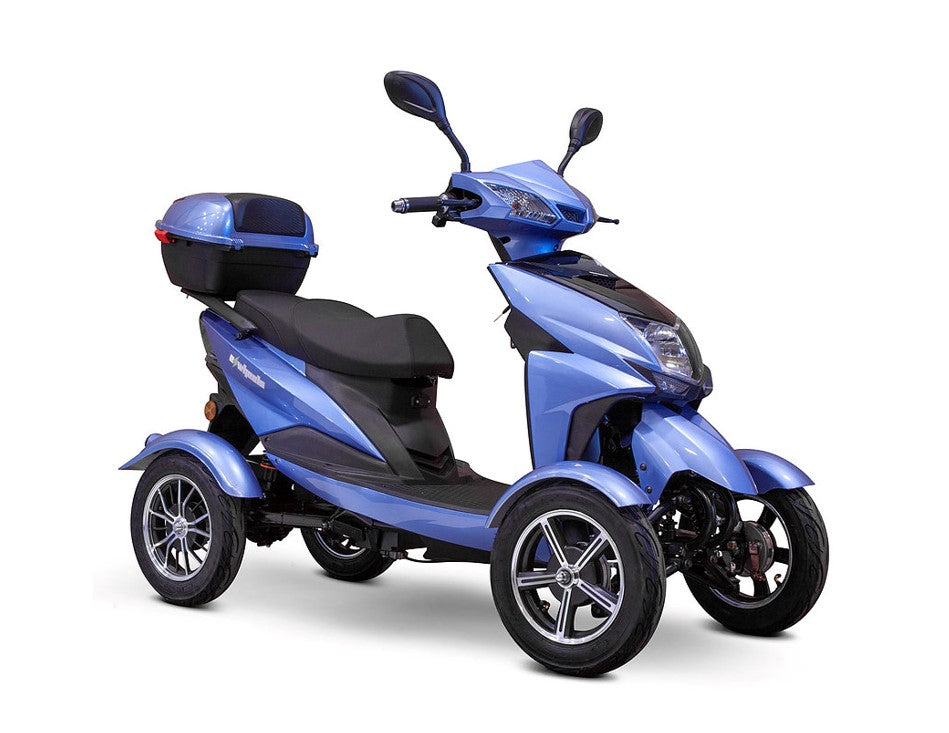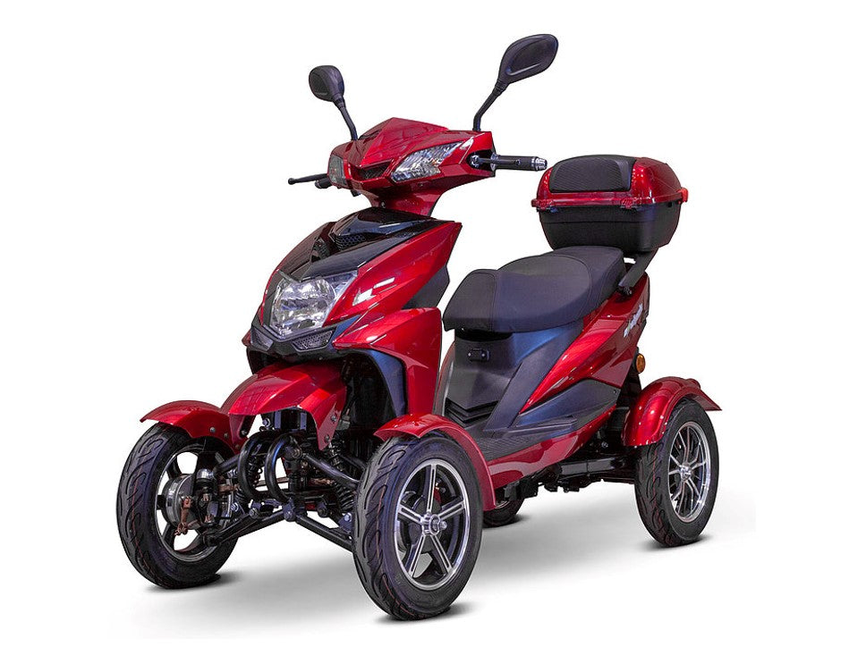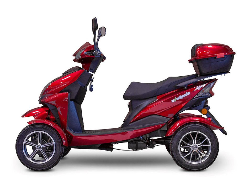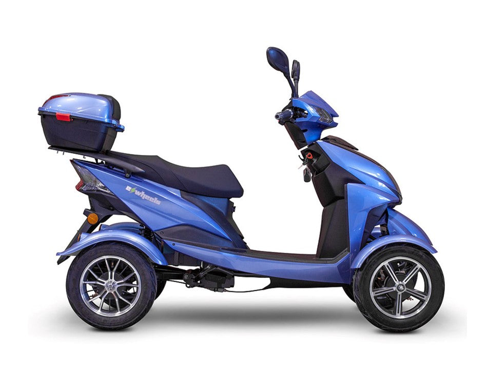 The EW-14 Four Wheel Scooter has a maximum speed of 15 MPH and can travel up to 40 miles on a single charge.Â