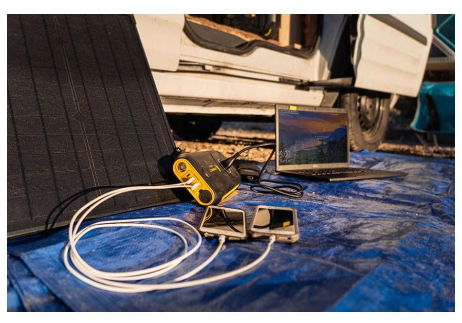 This small, portable solar panel will charge the Lion Cub GO power unit and smaller USB devices directly. It comes with a built-in 11.8" dual USB cord and two USB outputs. At only 4.5 pounds, it's easy to grab-and-go and use it outside almost anywhere the sun is shining directly.