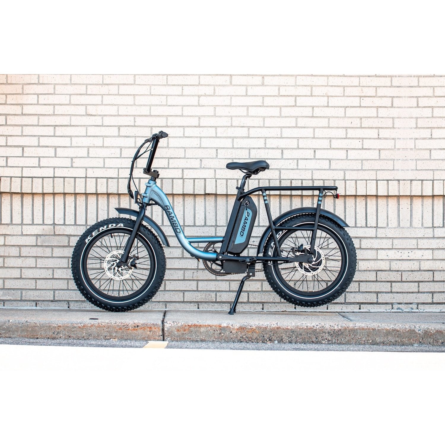If you need an easy, everyday ride with innate power, choose the Rambo Rooster Fat Tire Electric Bike by Rambo Bikes! This powerful electric bike sports the all-loved step-thru frame and a rigid suspension, yet has all the premium components and robust design expected of bikes made by Rambo. This entry-level bike is perfect for individuals who are just getting started into electric bikes, like casual riders, teenagers, and young adults. It comes with premium fat tires, so it is excellent for the road and can travel on the grass or bush. This fat tire electric bike is ideally suited for trekking the countryside or grasslands. The Rambo Rooster is also a perfect daily rider and for weekend adventurers.