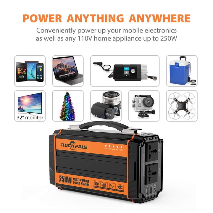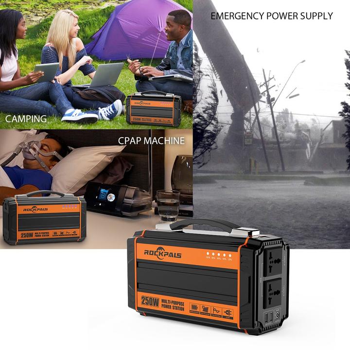- [2020 UPGRADED 250-WATT POWERFUL AC, USB AND 12V OUTPUTS] Compared to most power station on the market, Rockpals RP250W has upgraded the AC output to 250W continuous (300W surge max) dual AC outputs, built-in 2x USB 2.1A and 4x DC 12V ( 60W ) ports, act as emergency backup power for home/ travel/ camping.