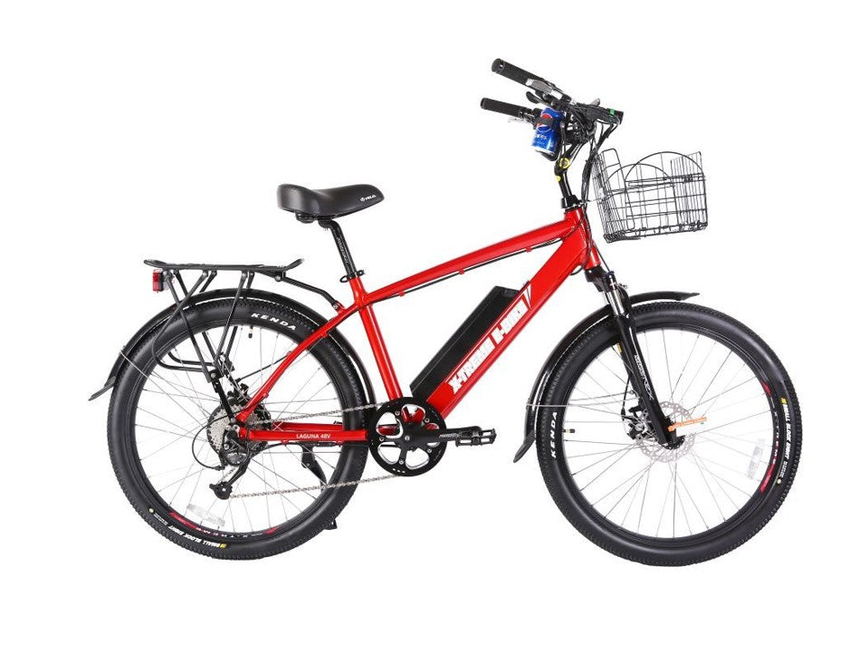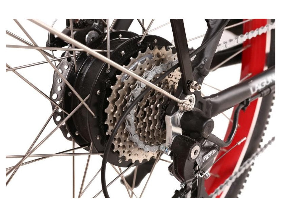 The Laguna Beach Cruiser 48 Volt Lithium Powered Electric Bicycle is a Lithium Battery powered Electric Bicycle cranking out 500 Watts from the Bafang High Torque Zero Resistance Clutch Motor. This bike features a lightweight, compact lithium LiPo4 48 volt 10.4 Ah integrated battery pack providing a considerable amount of power greater than our 24 volt or 36 volt models. This bike comes with everything Aluminum - every bolt, every nut, every nipple, every spoke. That means no rust! The 100% hand welded lightweight aluminum frame bicycle has Atlus Shimano 9-Speed Gears & Shifting System, Suntour 700C Front Suspension, aluminum rims with quick release axle on the front and a water proof quick disconnect on the rear.