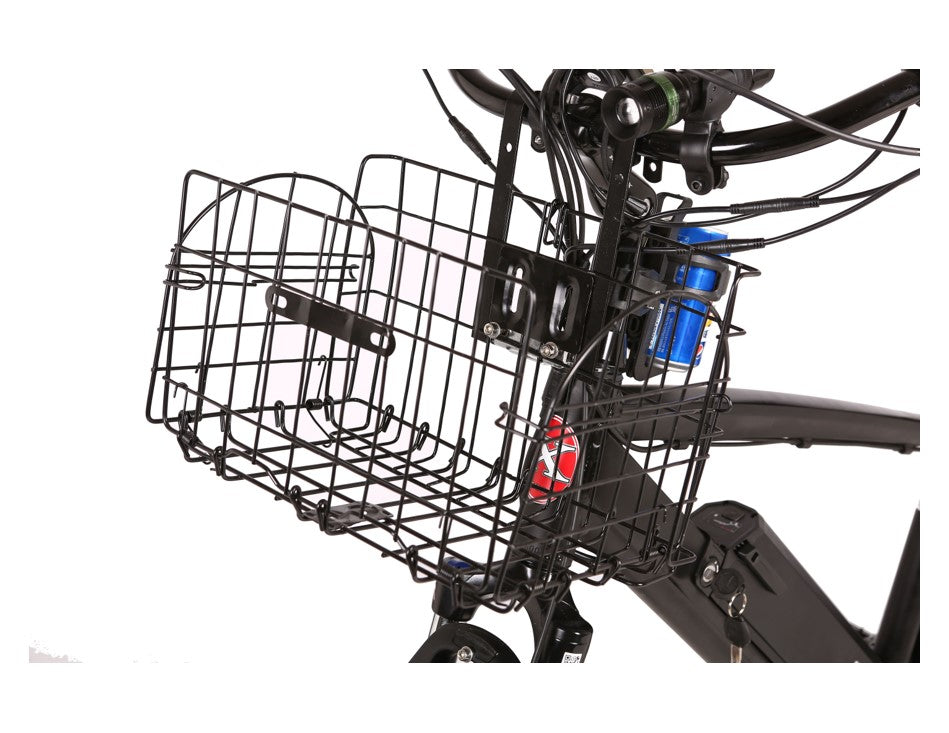 This electric beach cruiser bicycle comes standard with a folding basket that can be hung on either the front handle bars or on either side of the rear rack. Also included is a high quality beverage holder. There is no extra charge for the basket or holder!