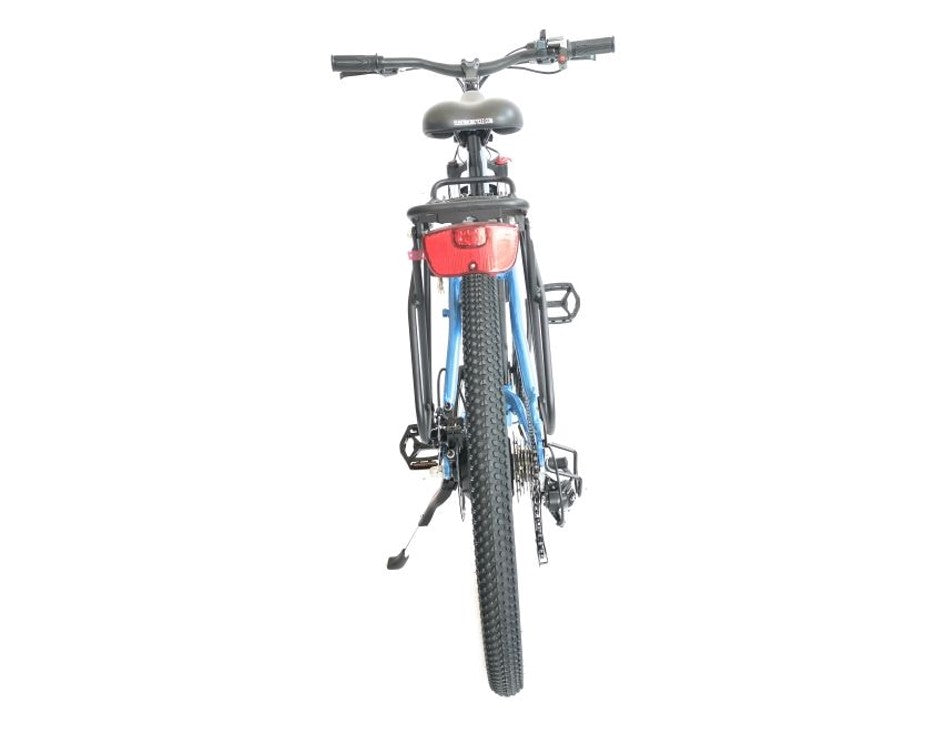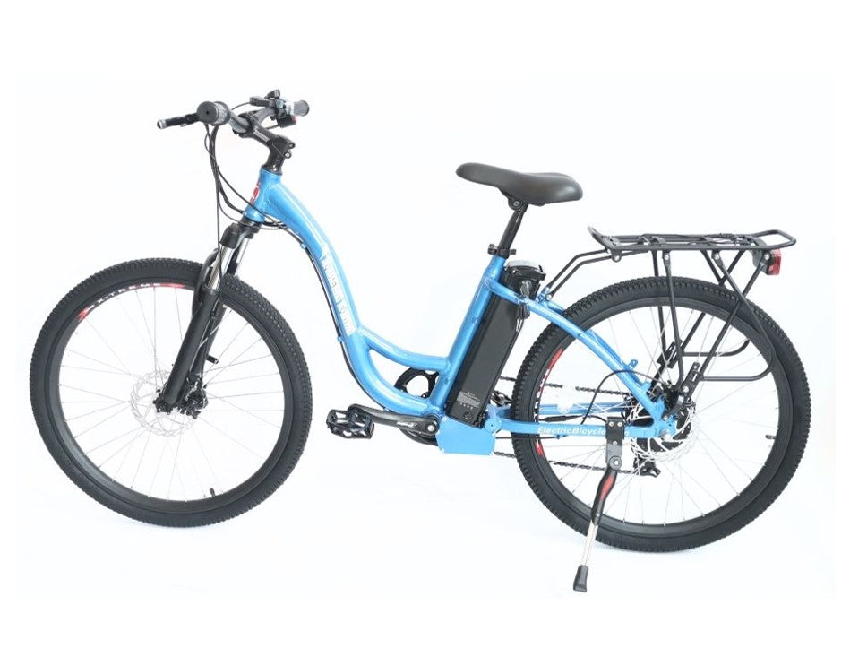 The TC-36 is an affordable 36 Volt Lithium Battery powered women's frame Electric Step-Through Mountain Bicycle Bicycle, running on a 350 Watt Zero Resistance rear hub motor. This bike is made with many top of the line components this model includes a 7 Speed Shimano Tourney® Gears & Shifter System, 7 Lightweight Lithium LiPo4 Batteries (36 Volts 10 Ah), a 100% Aluminum Alloy Frame, JAK Front & Rear Disk Brakes and a fully Adjustable Seat. The TC-36 comes with the PAS (Pedal Assist System) like our 24 Volt line of bikes which allows for the to turn the motor on and off and also indicates the battery life level. The speed is controlled with a twist throttle.