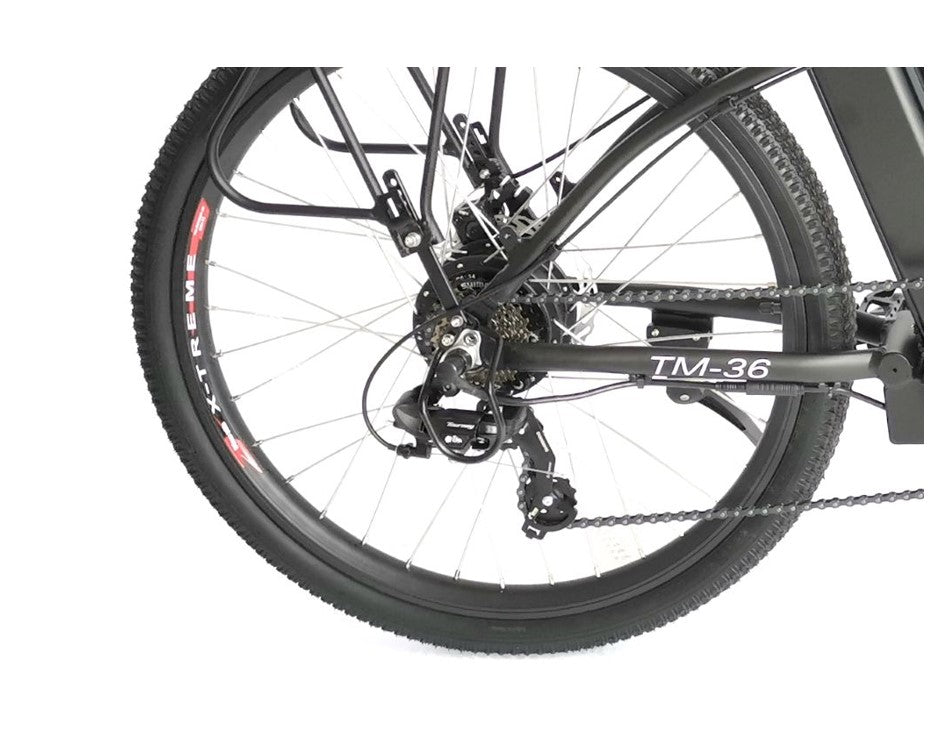 The TM-36 is an affordable 36 Volt Lithium Battery powered men's frame Electric Mountain Bicycle Bicycle, running on a 350 Watt Zero Resistance rear hub motor. This bike is made with many top of the line components this model includes a 7 Speed Shimano Tourney® Gears & Shifter System, 7 Lightweight Lithium LiPo4 Batteries (36 Volts 10 Ah), a 100% Aluminum Alloy Frame, JAK Front & Rear Disk Brakes and a fully Adjustable Seat. The TM-36 comes with the PAS (Pedal Assist System) like our 24 Volt line of bikes which allows for the to turn the motor on and off and also indicates the battery life level. The speed is controlled with a twist throttle.